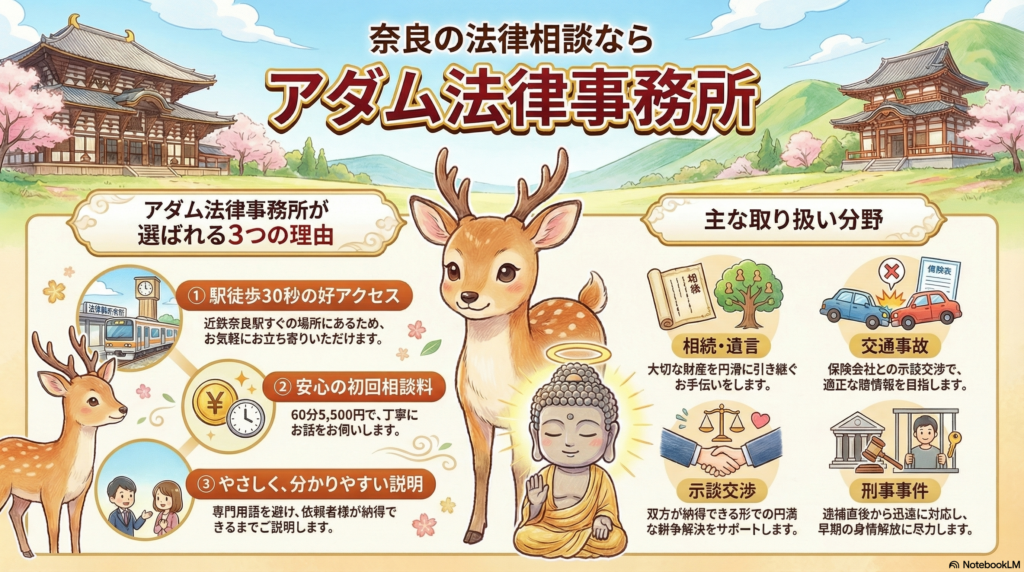 アダム法律事務は、奈良市の近鉄奈良駅から徒歩30秒の東向商店街の中にございます。