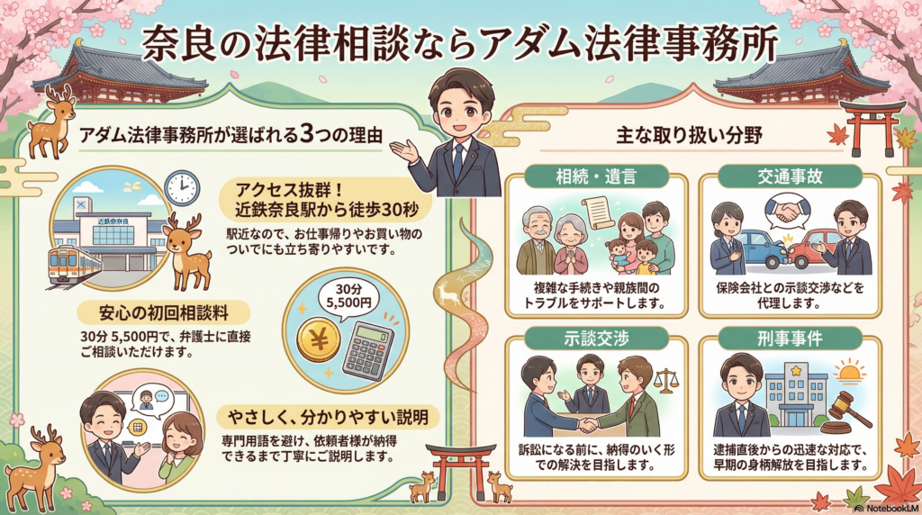 アダム法律事務は、奈良市の近鉄奈良駅から徒歩30秒の東向商店街の中にございます。